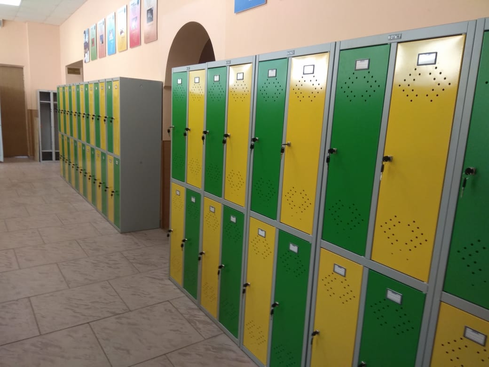 В школе мы установили и собрали шкафы для раздевалки из 0,8 мм металла, корпус окрашен краской в цвете Ral 7038, окраска дверей Ral 1018 и 6018.