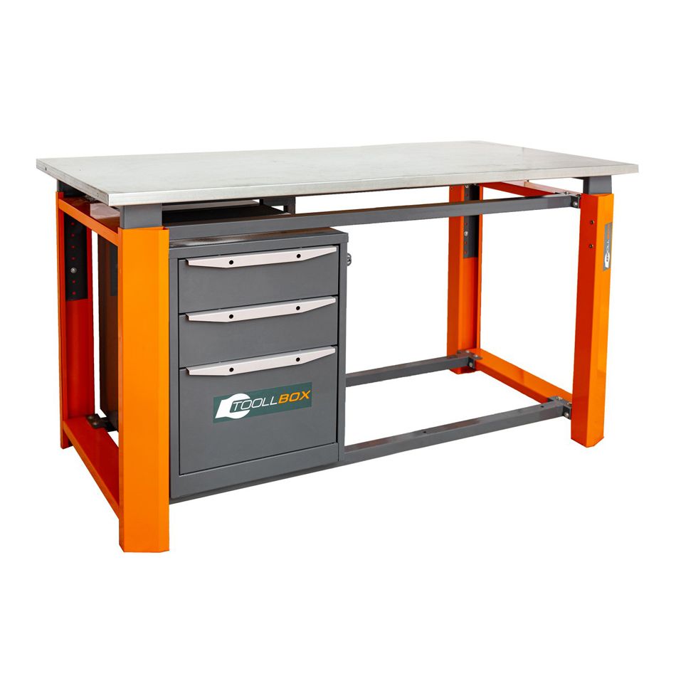 Верстак однотумбовый: в комплектации предусмотрена одна тумба с тремя выдвижными ящиками. Ящики подходят для хранения расходников, оснастки и инструмента, который должен быть под рукой, а не «гулять» по столешнице. Максимальная распределенная нагрузка на один ящик — 45 кг. У тумбы есть петли для запирания на навесной замок — полезная мелочь, если верстак стоит в общем помещении или на участке с несколькими сменами.